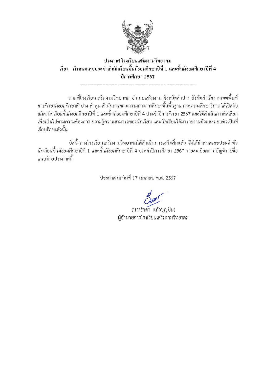 ประกาศเลขประจำตัวนักเรียนชั้นมัธยมศึกษาปีที่ 1 และชั้นมัธยมศึกษาปีที่ 4 ปีการศึกษา 2567