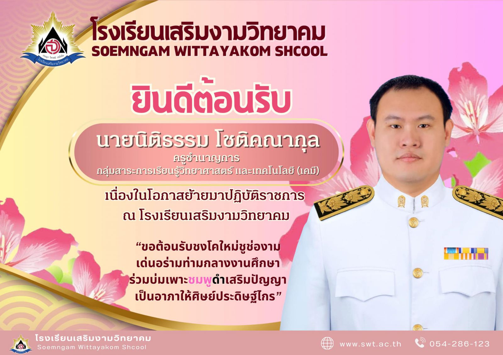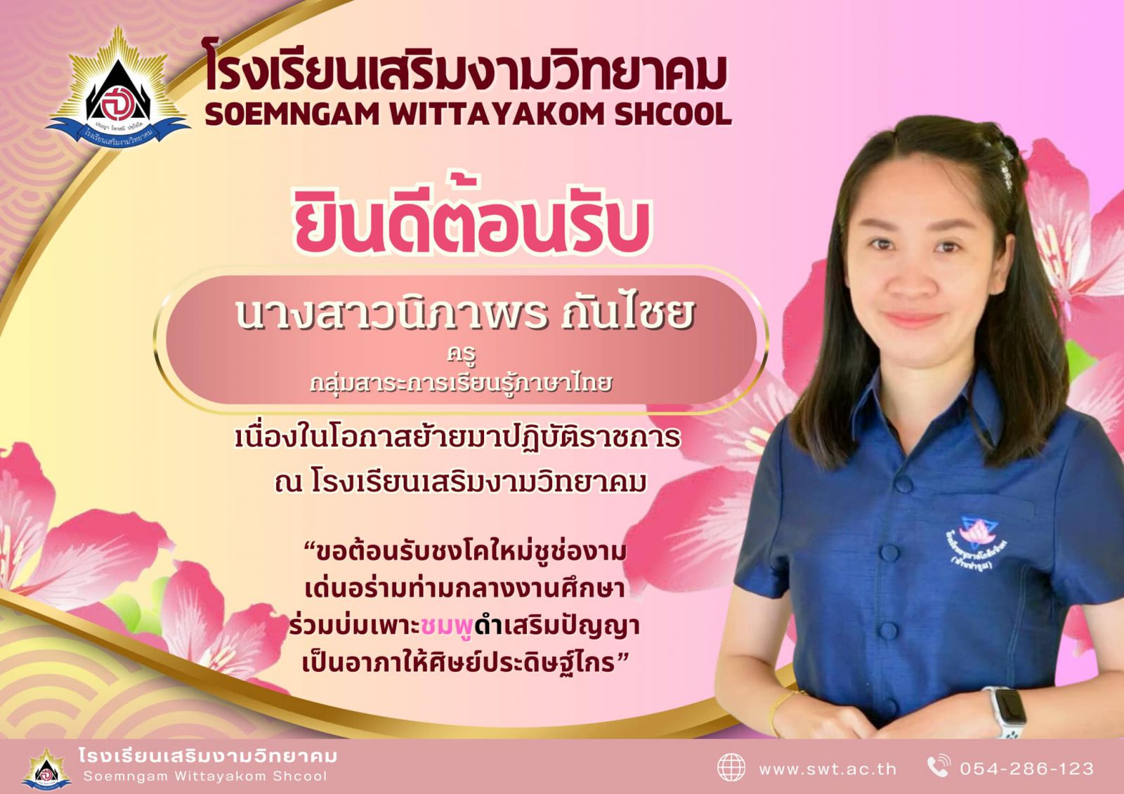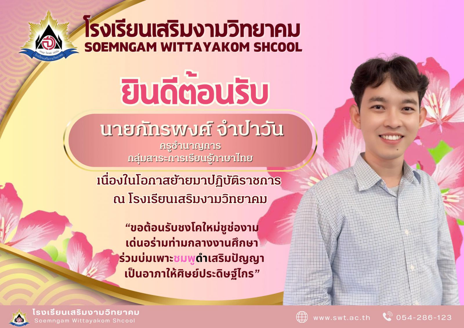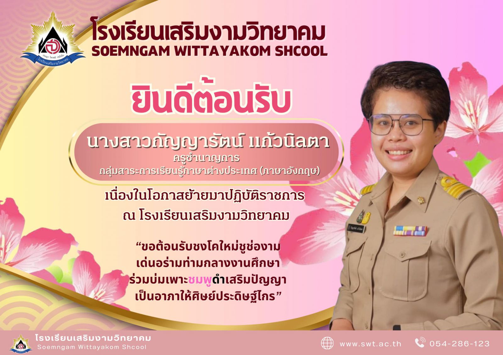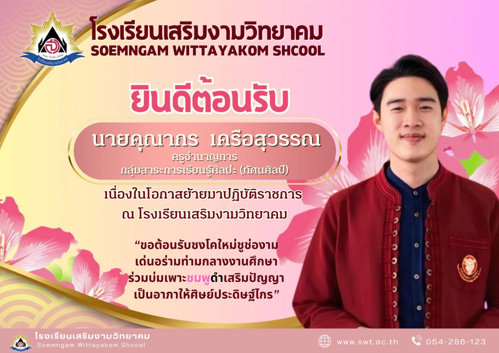 ขอแสดงความยินดี และยินดีต้อนรับ คุณครูเนื่องในโอกาสที่ย้ายมาปฏิบัติราชการ ณ โรงเรียนเสริมงามวิทยาคม จำนวนทั้ง 7 ท่าน “ขอต้อนรับชงโคใหม่ชูช่องาม เด่นอร่ามท่ามกลางงานศึกษา ร่วมบ่มเพาะชมพูดำเสริมปัญญา เป็นอาภาให้ศิษย์ประดิษฐ์ไกร”
