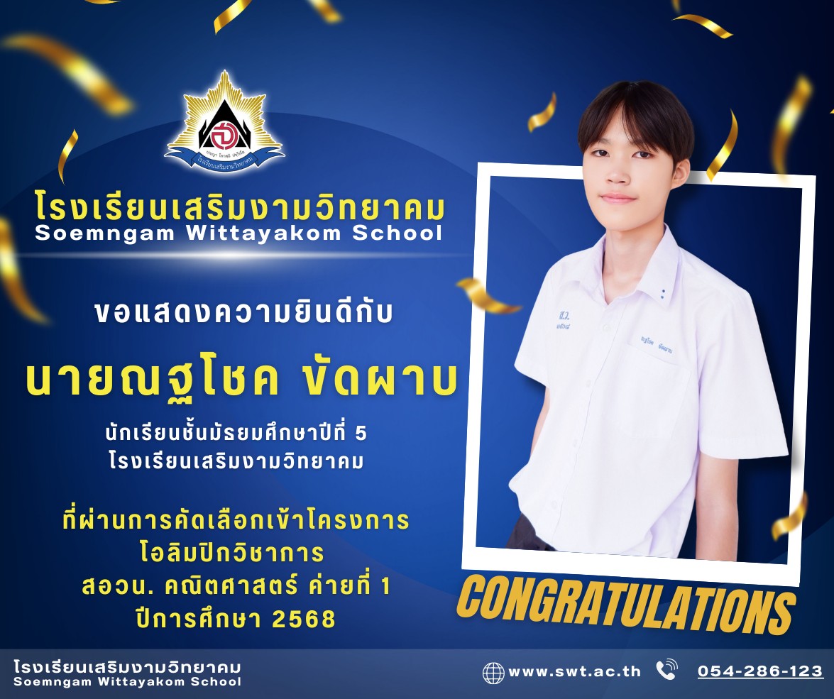 โรงเรียนเสริมงามวิทยาคม ขอแสดงความยินดีกับนายณฐโชค ขัดผาบ นักเรียนชั้นมัธยมศึกษาปีที่ 5/1 ที่ผ่านการคัดเลือกเข้าร่วมโครงการโอลิมปิกวิชาการ สอวน. สาขาคณิตศาสตร์ ค่ายที่ 1 ประจำปีการศึกษา 2568