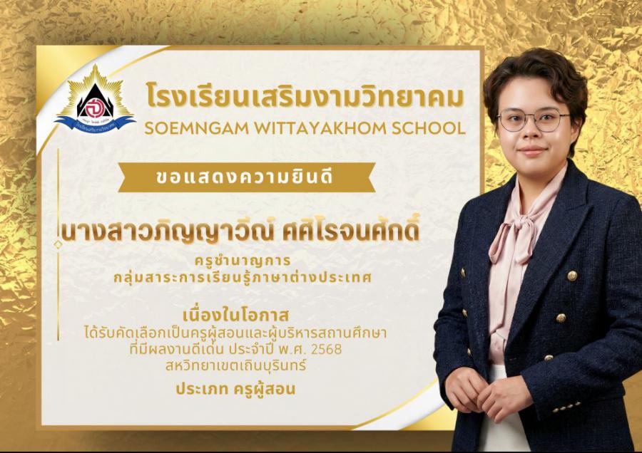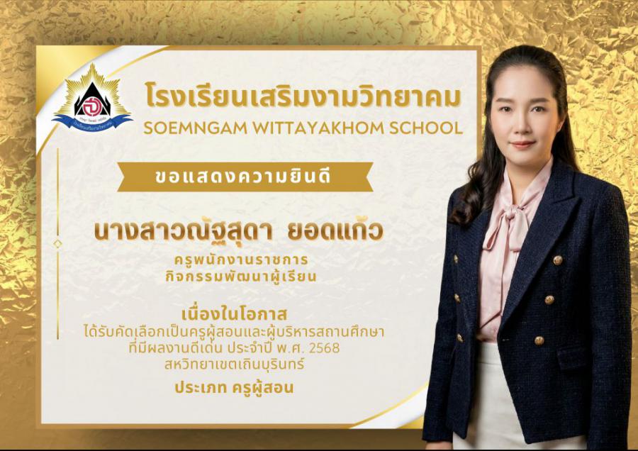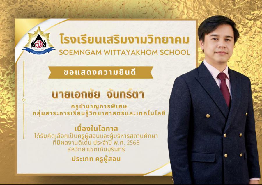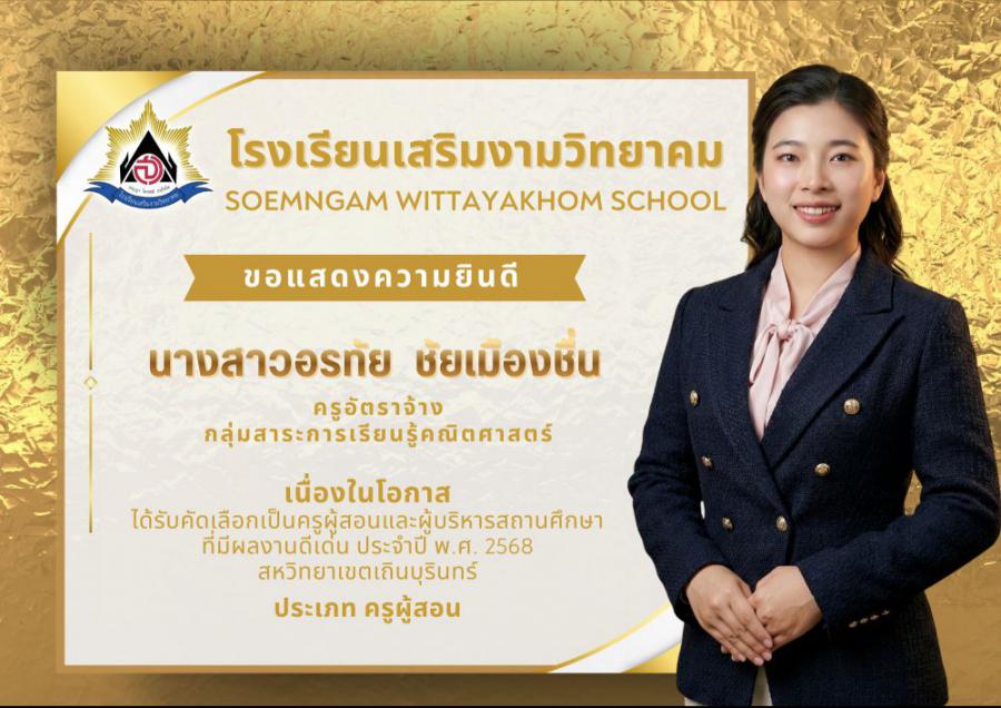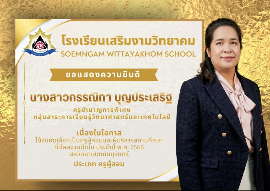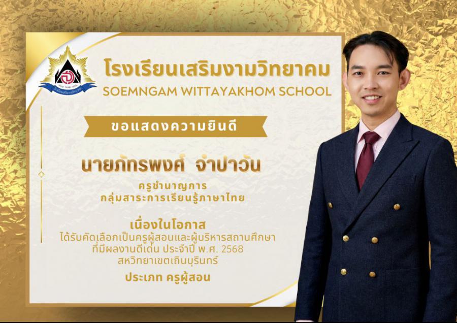 โรงเรียนเสริมงามวิทยาคม ขอแสดงความยินดีอย่างยิ่ง เนื่องในโอกาสบุคลากรทางการศึกษา ได้รับคัดเลือกเป็นครูผู้สอนและผู้บริหารสถานศึกษาที่มีผลงานดีเด่น ประจำปี พ.ศ. 2569 สหวิทยาเขตเถินบุรินทร์ ซึ่งสะท้อนถึงความมุ่งมั่น ทุ่มเท และความเป็นมืออาชีพในการจัดการศึกษา อันเป็นแบบอย่างที่ดีแก่เพื่อนร่วมวิชาชีพและนักเรียน