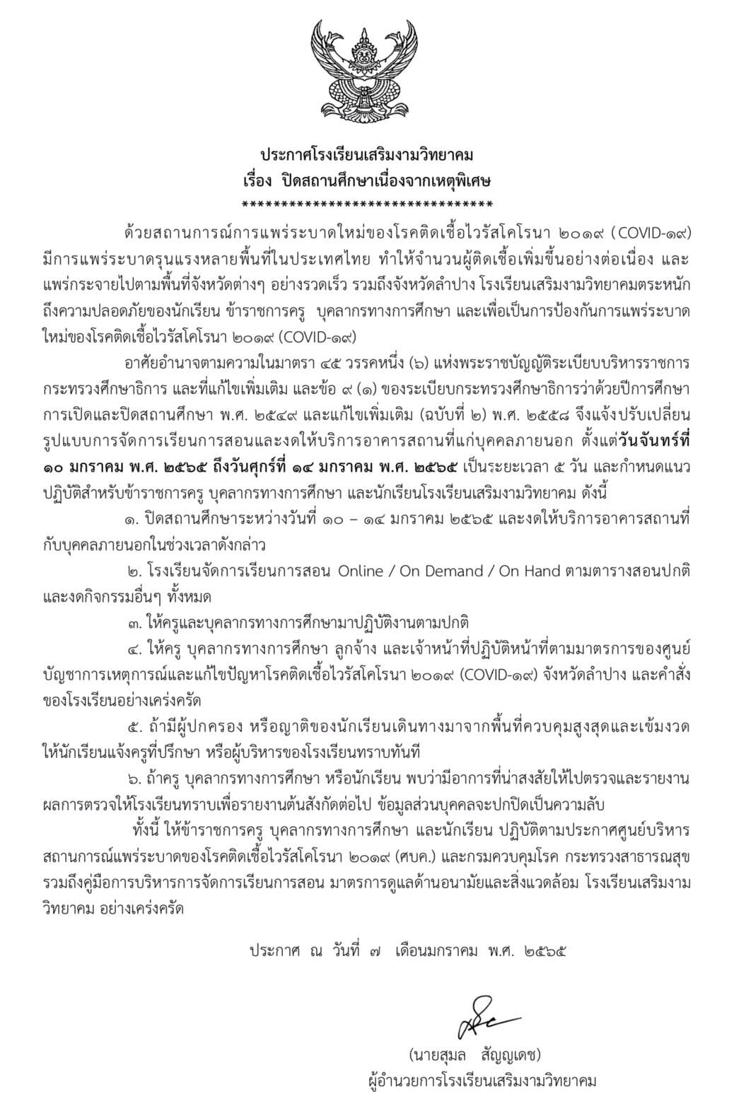 ประกาศโรงเรียนเสริมงามวิทยาคม เรื่อง ปิดสถานศึกษาเนื่องด้วยเหตุพิเศษ